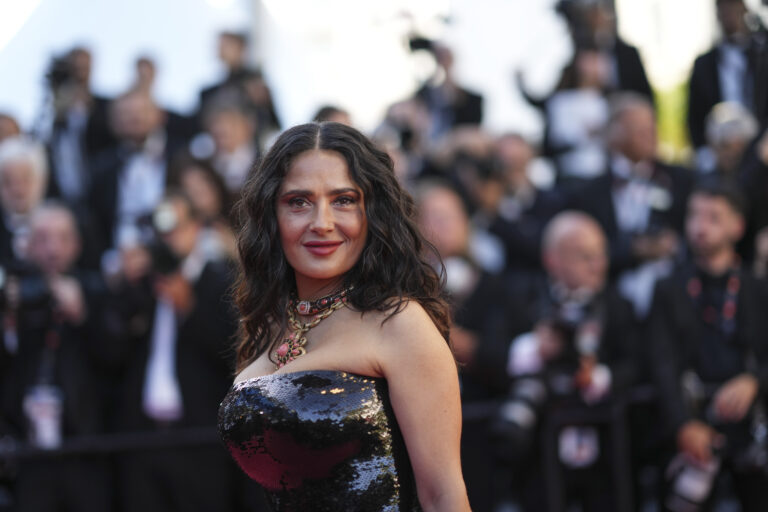 Salma Hayeková pózuje pri príchode na premiéru filmu "Emilia Perez" na 77. medzinárodnom filmovom festivale v Cannes. Foto: SITA/AP