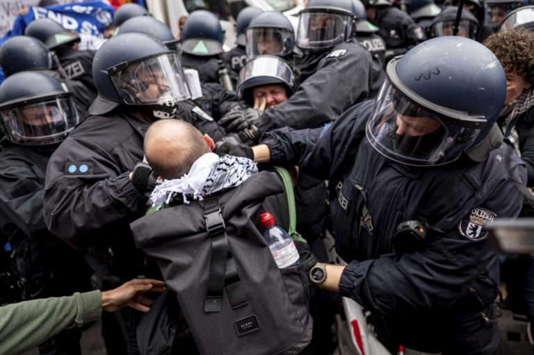 Polícia zatýka demonštranta počas propalestínskej demonštrácie v Berlíne. Foto: Fabian Sommer/dpa via AP
