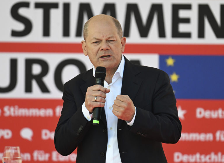 Nemecký kancelár Olaf Scholz reční na veľkom zjazde SPD pred voľbami do Európskeho parlamentu. Foto: Uli Deck/dpa via AP