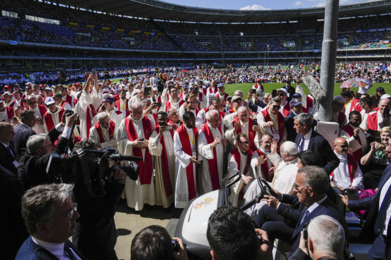 Pápež František prichádza na štadión Bentegodi, kde bude sláviť omšu počas jednodňovej pastoračnej návštevy. Foto: SITA/AP