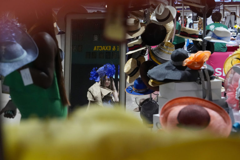 Žena si skúša ozdobný klobúk pred dostihmi Preakness Stakes na dostihovej dráhe Pimlico. Foto: SITA/AP