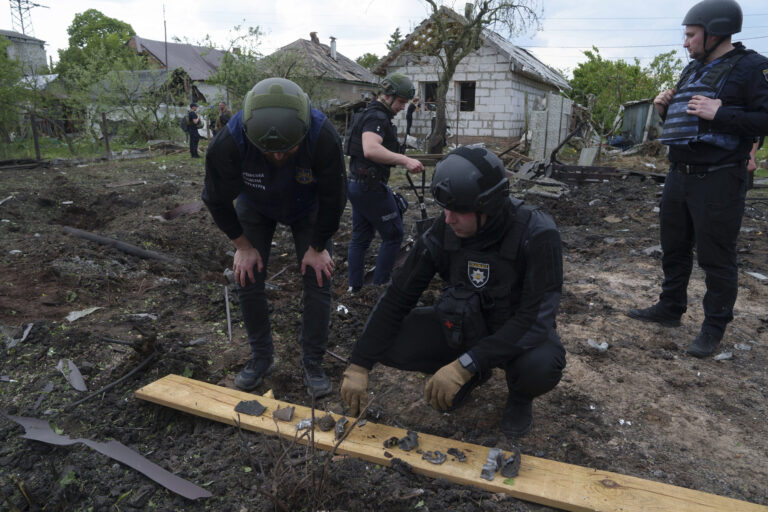 Ukrajinský policajt a prokurátor pre vojnové zločiny si prezerajú úlomky klznej bomby. Foto: SITA/AP