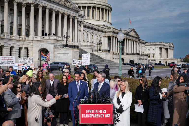 Zľava: Poslankyňa Ro Khanna (demokratka za Kaliforniu), poslanec Thomas Massie (republikán) za Kentucky a poslankyňa Marjorie Taylor-Greene (republikánka) za Georgiu počas tlačovej konferencie v Kapitole, kde sa Snemovňa reprezentantov pripravuje na hlasovanie o zákone o transparentnosti spisov o Epsteinovi. Pridali sa k nim pozostalí a rodinní príslušníci, ktorí rozprávali svoje osobné príbehy o Epsteinovi. Washington, 18. novembra 2025.. Foto: AP Photo/J. Scott Applewhite