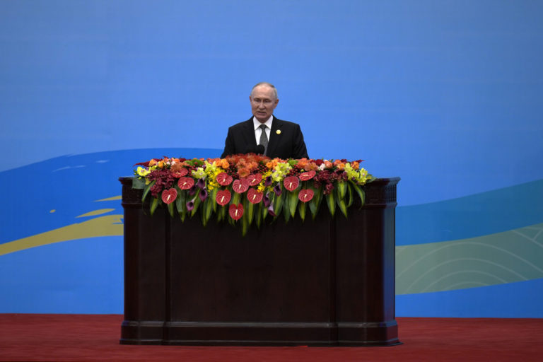 Ruský prezident Vladimir Putin počas svojho prejavu na čínskom fóre Belt and Road Forum. Foto: SITA/AP.