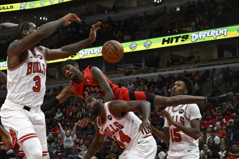 Útočník Toronta Raptors Jalen McDaniels (uprostred) sa snaží dostať k lopte počas druhého polčasu prípravného zápasu basketbalovej NBA proti Chicago Bulls. Foto: SITA/AP.