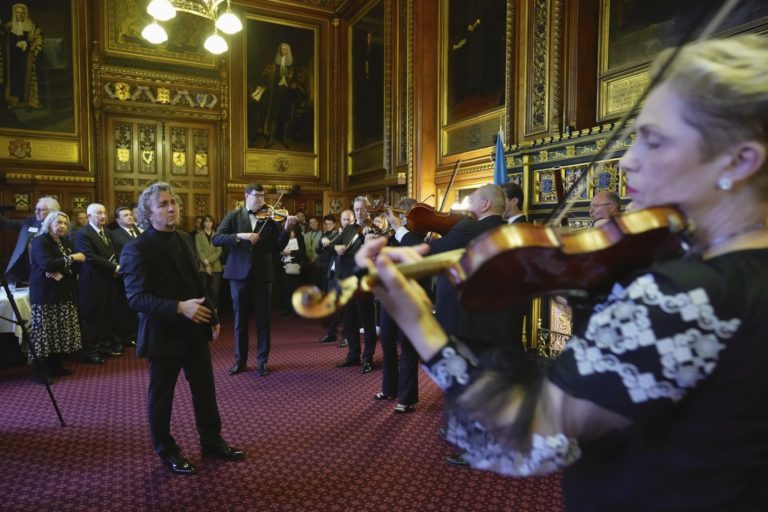 Muzikanti z Národného symfonického orchestra Ukrajiny hrajú improvizovaný koncert pre predsedníčku Dolnej snemovne Lindsay Hoyle v Londýne. Foto: SITA/AP.