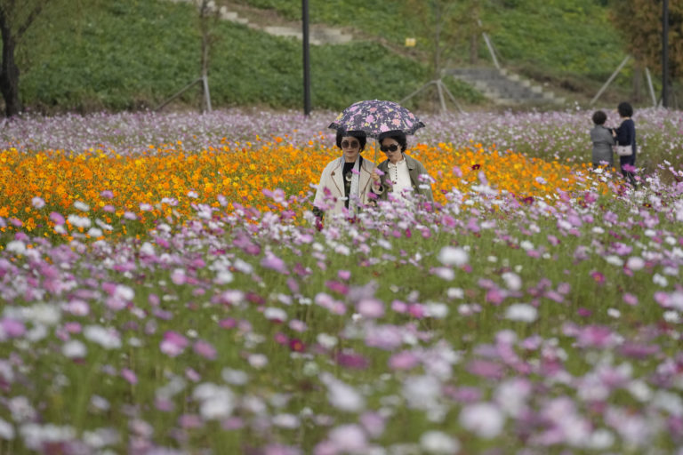 Návštevníci sa prechádzajú po poli rozkvitnutých kvetov v Kojangu v Južnej Kórei. Foto: SITA/AP.