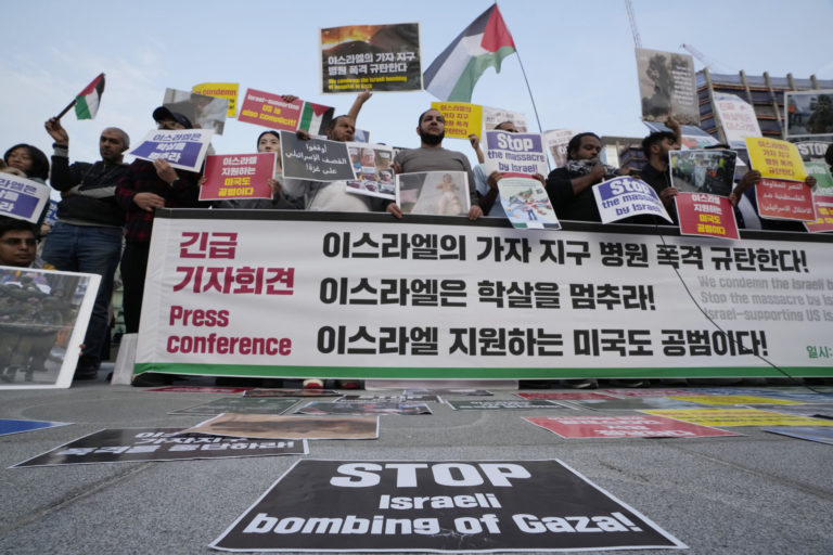 Skupina priaznivcov Palestíny protestuje pred veľvyslanectvom USA v juhokórejskom Soule, aby vyzval Izrael k prerušeniu útokov na pásmo Gazy. Foto: SITA/AP.