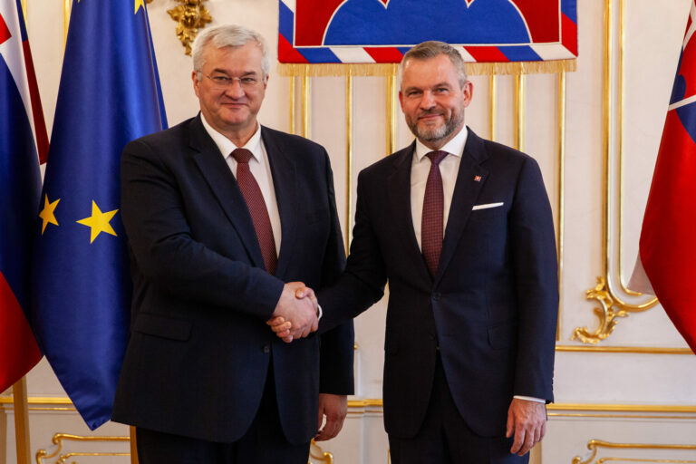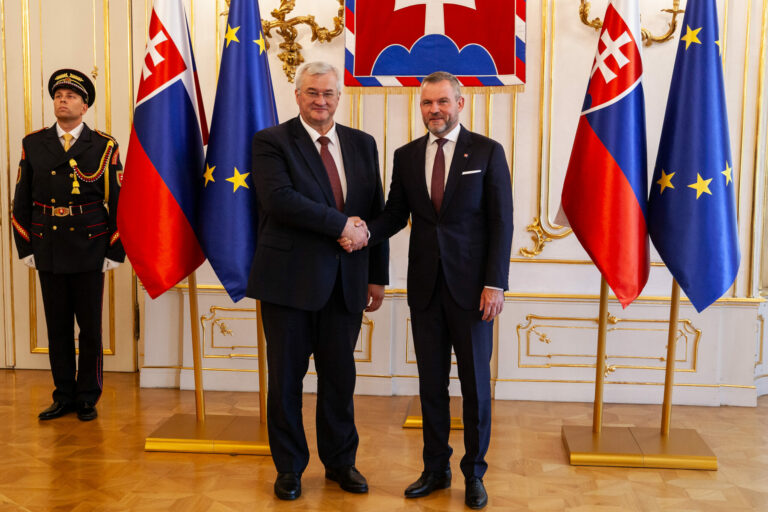 Zľava: Minister zahraničných vecí Andrii Sibyha a Prezident SR Peter Pellegrini počas prijatia v Prezidentskom paláci v Bratislave pri príležitosti prijatia ministra zahraničných vecí Ukrajiny počas jeho oficiálnej návštevy na Slovensku prezidentom SR. Bratislava, 18. september 2024. Foto: SITA/Bokor Tomáš