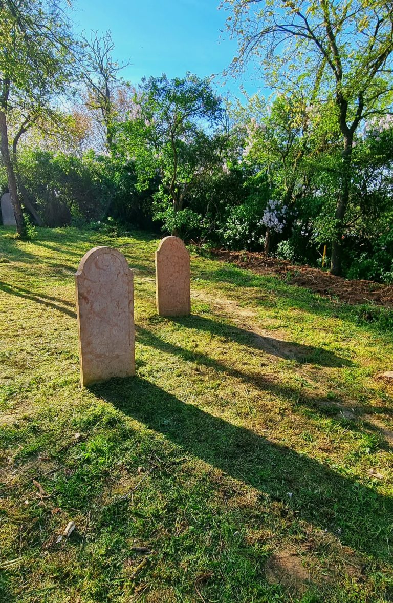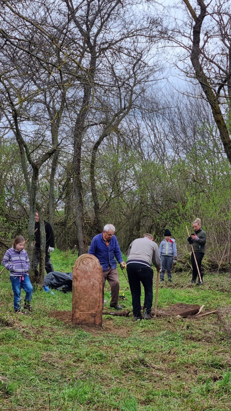 Dobrovoľníci z občianskeho združenia Fontis počas obnovy náhrobných kameňov na židovskom cintoríne v obci Michal nad Žitavou v okrese Nové Zámky. Michal nad Žitavou, 15. apríl 2024. Foto: SITA/OZ Fontis