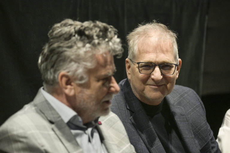 Zľava: Generálny riaditeľ RTVS Ľuboš Machaj a generálny riaditeľ Slovenského filmového ústavu Peter Dubecký počas tlačovej konferencie v kine Lumiére k tohoročnému udeľovaniu Národných filmových cien Slnko v sieti a predstavenia osobnosti slovenskej kinematografie, ktorej bolo na slávnostnom udeľovaní cien odovzdané ocenenie za celoživotný prínos slovenskej kinematografie. Bratislava, 19. apríl 2024. Foto: SITA/Milan Illík