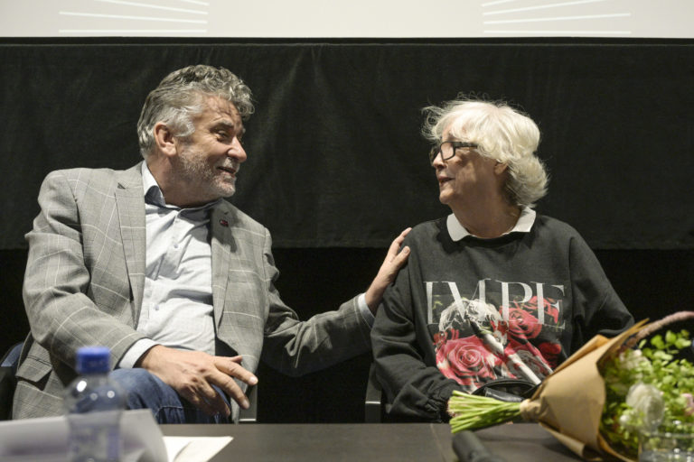 Zľava: Generálny riaditeľ RTVS Ľuboš Machaj a osobnosť slovenskej kinematografie herečka Božidara Turzonovová počas tlačovej konferencie v kine Lumiére k tohoročnému udeľovaniu Národných filmových cien Slnko v sieti a predstavenia osobnosti slovenskej kinematografie, ktorej bolo na slávnostnom udeľovaní cien odovzdané ocenenie za celoživotný prínos slovenskej kinematografie. Bratislava, 19. apríl 2024. Foto: SITA/Milan Illík