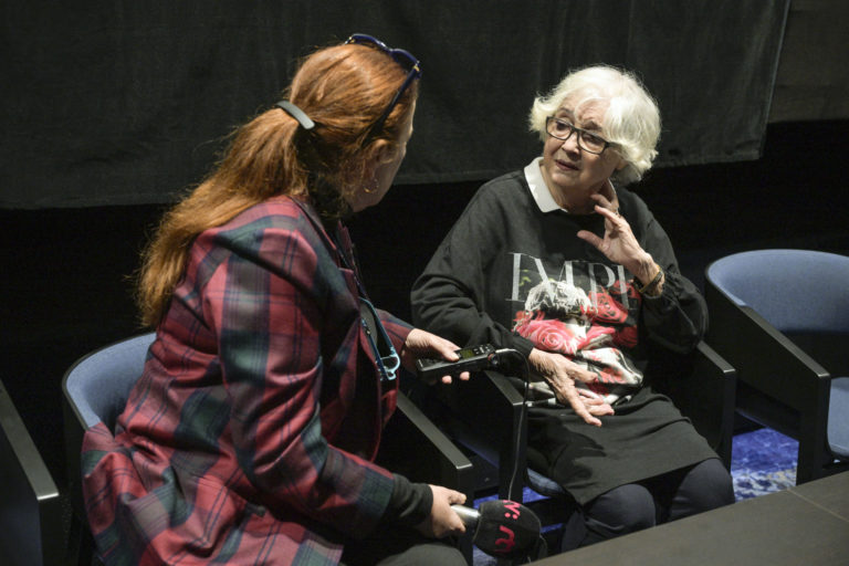Osobnosť slovenskej kinematografie herečka Božidara Turzonovová (vľavo) počas tlačovej konferencie v kine Lumiére k tohoročnému udeľovaniu Národných filmových cien Slnko v sieti a predstavenia osobnosti slovenskej kinematografie, ktorej bolo na slávnostnom udeľovaní cien odovzdané ocenenie za celoživotný prínos slovenskej kinematografie. Bratislava, 19. apríl 2024. Foto: SITA/Milan Illík
