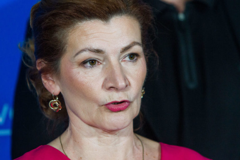 Prednostka okresného úradu Žiliny Emília Pavlusíková počas tlačového brífingu Ministerstva dopravy SR k aktuálnej situácii pod Strečnom a urýchleniu výstavby tunela Višňové. Bratislava, 19. apríl 2024. Foto: SITA/Ľudovít Vaniher