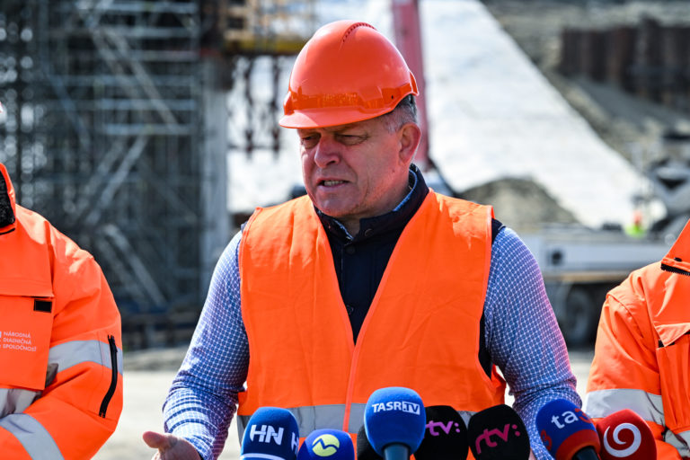 Predseda vlády SR Robert Fico počas tlačového brífingu v rámci kontrolného dňa predsedu vlády SR a ministra dopravy na stavbe križovatky D1 a D4. Bratislava, 19. apríl 2024. Foto: SITA.