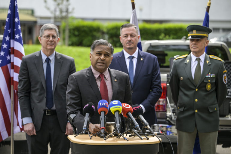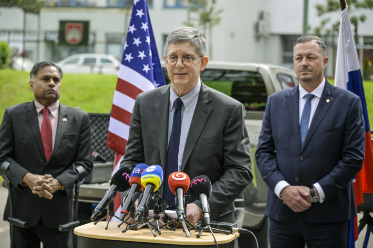 Zľava: Veľvyslanec USA v SR Guatam Rana, prezident finančnej správy Jozef Kiss a programový riaditeľ Ministerstva energetiky USA Richard Pappas počas tlačového brífingu Finančnej správy SR na parkovisku Finančného riaditeľstva SR, na ktorom si slávnostne prevzala od Ministerstva energetiky Spojených štátov amerických (USA) technické zariadenia na odhaľovanie rádioaktívnych materiálov a kontrabandu v hodnote takmer milión eur. Bratislava, 19. apríl 2024. Foto: SITA/Milan Illík