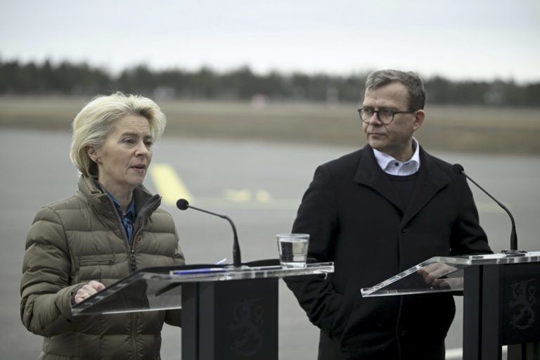 Predsedníčka Európskej komisie Ursula von der Leyenová (vľavo) a fínsky premiér Petter Orpo počas spoločnej tlačovej konferencie na letisku Lappeenranta vo východnom Fínsku- Foto: Antti Aimo-Koivisto/Lehtikuva via AP