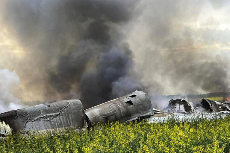 Trosky bombardéra Tu-22M3, ktorý sa zrútil v Krasnogvardejskom okrese Stavropoľského kraja v Rusku. Foto: Governor of the Stavropol region Vladimir Vladimirov Telegram channel via AP