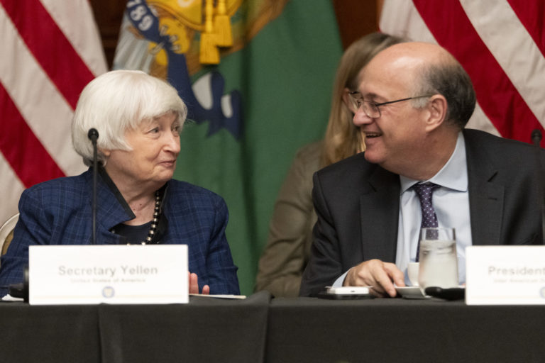 Ministerka financií Janet Yellenová (vľavo) s prezidentom Medziamerickej rozvojovej banky Ilanom Goldfajnom počas stretnutia Amerického partnerstva pre hospodársku prosperitu s ministrami financií. Foto: SITA/AP