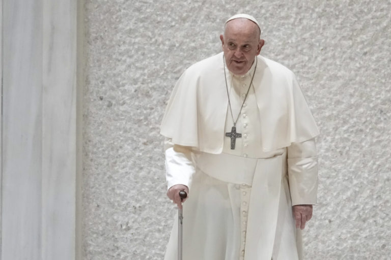 Pápež František prichádza na stretnutie so študentmi a učiteľmi siete Škola mieru v Aule Pavla VI. vo Vatikáne. Foto: SITA/AP