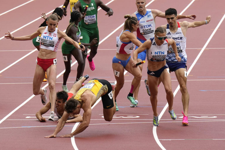 Jean Paul Bredau z Nemecka spadol v zmiešanej štafete na 4x400 metrov počas MS v atletike v Budapešti. Foto: SITA/AP