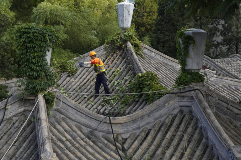 Muž odstraňuje popínavé rastliny zo strechy historického domu v Pekingu. Foto: SITA/AP