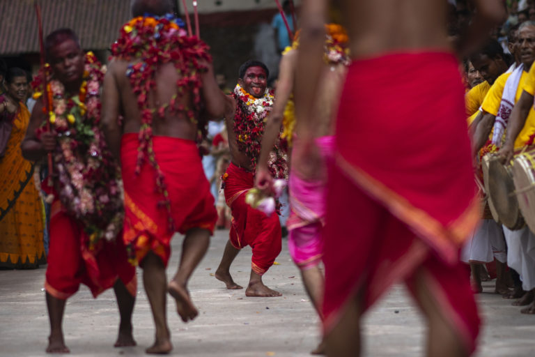 Hinduistickí kňazi na festivale Deodhani v chráme Kamakhya v Guwahati v Indii. Tváre majú pomazané farbami a krvou z obetovaných zvierat. Foto: SITA/AP