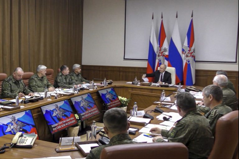 Ruský prezident Vladimir Putin na stretnutí s najvyššími vojenskými predstaviteľmi v sídle ruského južného vojenského okruhu v Rostove na Done. Foto: SITA, RU-RTR Russian Television via AP