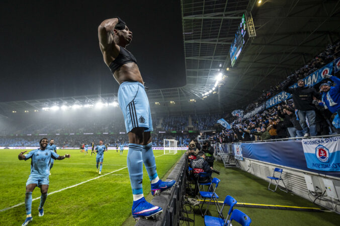 Cesar Blackman z ŠK Slovan Bratislava (uprostred) sa teší po góle 1-0 počas futbalového zápasu hlavnej fázy Konferenčnej ligy UEFA 2025/26 medzi ŠK Slovan Bratislava - BK Häcken. Bratislava, 18. december 2025. Foto: SITA/Milan Illík