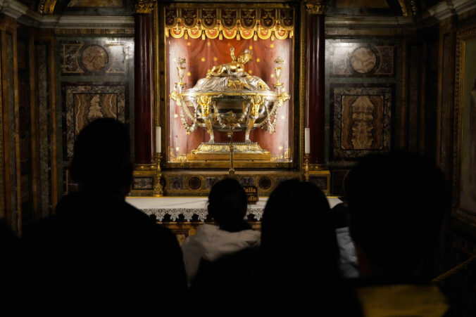 Veriaci stoja pred relikviou Svätých jasličiek v Bazilike Panny Márie Veľkej v Ríme, o ktorej sa predpokladá, že je súčasťou jaslí, kde bol uložený malý Ježiš. Taliansko, 19. decembra 2025. Foto: AP Photo/Gregorio Borgia