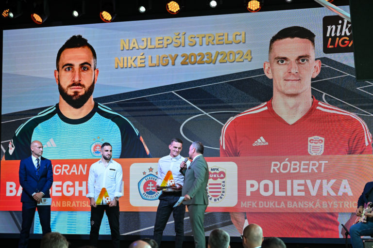 Uprostred zľava: Futbalisti Tigran Barseghjan a Róbert Polievka si preberajú Cenu Najlepší strelci Niké ligy 2023/2024 počas slávnostného vyhlásenia ankety Jedenástka sezóny Niké ligy 2023/2024. Bratislava, 19. máj 2024. Foto: SITA