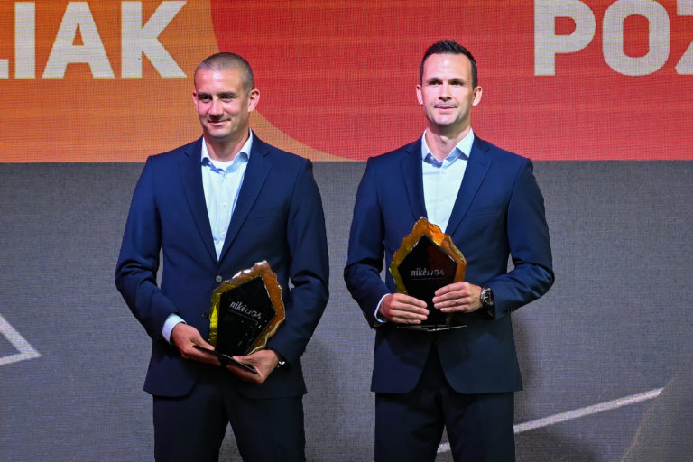 Zľava: Asistent rozhodcu Ján Pozor si prebral ocenenie za Najlepšieho asistenta rozhodcu Niké ligy 2023/2024 a rozhodca Ivan Kružliak si prebral ocenenie za Najlepšieho rozhodcu Niké ligy 2023/2024 počas slávnostného vyhlásenia ankety Jedenástka sezóny Niké ligy 2023/2024. Bratislava, 19. máj 2024. Foto: SITA