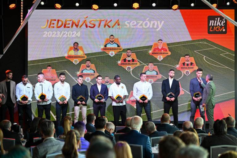 Sprava: Brankár Dominik Takáč z FC Spartak Trnava, stredopoliar Adrian Zeljkovič z FC Spartak Trnava, útočník Róbert Polievka z FK Dukla Banská Bystrica, obranca Yhoan Andzouana z FC DAC 1904 Dunajská Streda, záložník Peter Kováčik z FK Dukla Banská Bystrica, obranca Matúš Kmeť z AS Trenčín, útočník Michal Ďuriš z FC Spartak Trnava, záložník Juraj Kucka z ŠK Slovan Bratislava, záložník Tigran Barseghjan z ŠK Slovan Bratislava a obranca Kenan Bajrič z ŠK Slovan Bratislava počas slávnostného vyhlásenia ankety Jedenástka sezóny Niké ligy 2023/2024. Bratislava, 19. máj 2024. Foto: SITA