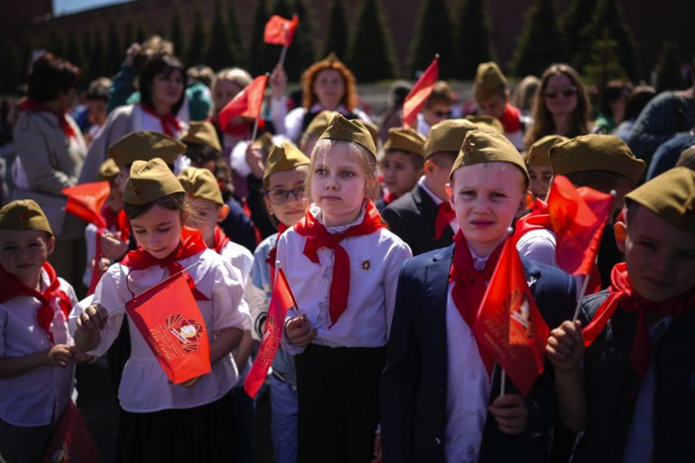 Dievčatá a chlapci vo vojenských klobúkoch v sovietskom štýle s červenými nákrčníkmi stoja na Červenom námestí po ceremónii na oslavu vstupu do organizácie Pioneers v Moskve v Rusku v nedeľu 19. mája 2024. Foto: SITA/AP