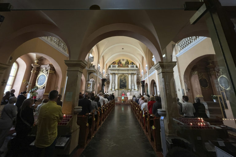 Návštevníci kostola sa v nedeľu 19. mája 2024 zúčastňujú na omši v Katedrále sv. Františka Xaverského v Banskej Bystrici. 19. máj 2024 Foto: SITA/AP