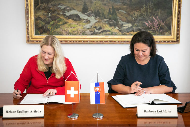 Sprava: Štátna tajomníčka Ministerstva investícií, regionálneho rozvoja a informatizácie SR Barbora Lukáčová a štátna tajomníčka Štátneho sekretariátu pre hospodárske záležitosti Švajčiarska Helene Budliger Artieda počas podpisu Rámcovej dohody o imprementácii druhého Švajčiarskeho príspevku medzi vládou SR a Švajčiarskou federálnou radou v strarej Národnej rade v Bratislave. Bratislava, 19. september 2023. Foto: SITA/Diana Černak