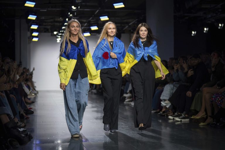 Zľava: dizajnérky Ksenia Schnaider, Nadya Dzyak a Elena Reva kráčajú po móle v Londýne s ukrajinskými vlajkami. Foto: SITA/Scott Garfitt/Invision/AP