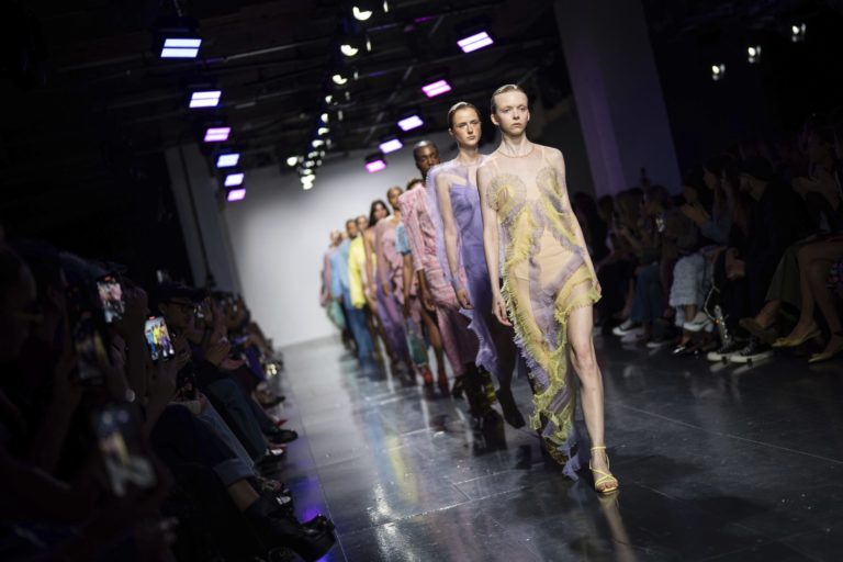 Modelky vyniesli na módnej prehliadke v Londýne kreácie z dielne Nadie Dzyak. Ksenia Schaider a ďalší ukrajinskí návrhári musia pokračovať vo vytváraní nových kúskov oblečenia aj napriek vojne na Ukrajine. Foto: SITA/Scott Garfitt/Invision/AP