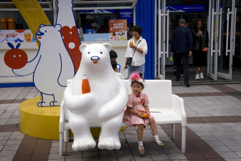 Dieťa sedí vedľa sochy ľadového medveďa pred predajňou nápojov na nákupnej ulici Wangfujing v Pekingu. Foto: SITA/AP