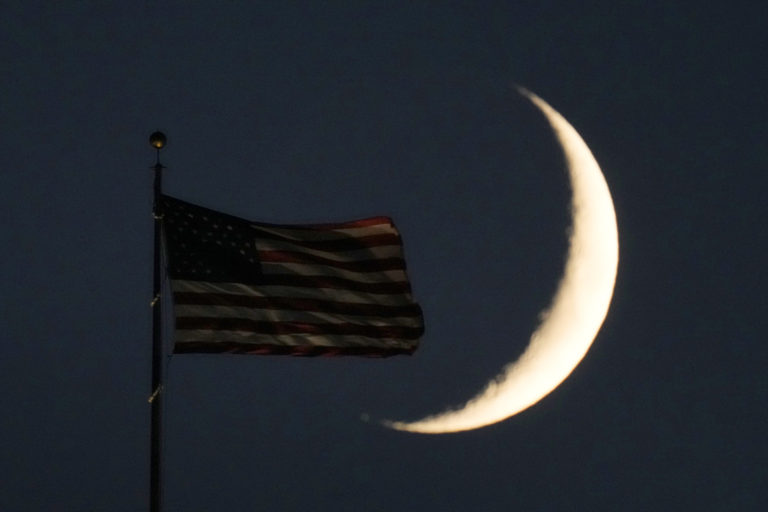 Polmesiac a vlajka Spojených štátov umiestnená na radnici v Kansas City. Foto: SITA/AP