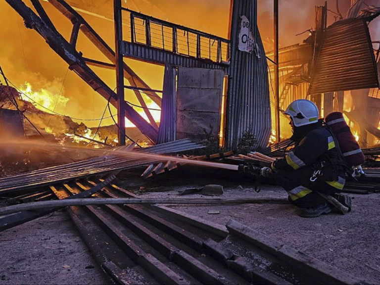 Hasiči sa snažia dostať pod kontrolu požiar po ruskom útoku na mesto Ľvov na Ukrajine. Foto: SITA/Ukrainian Emergency Service via AP