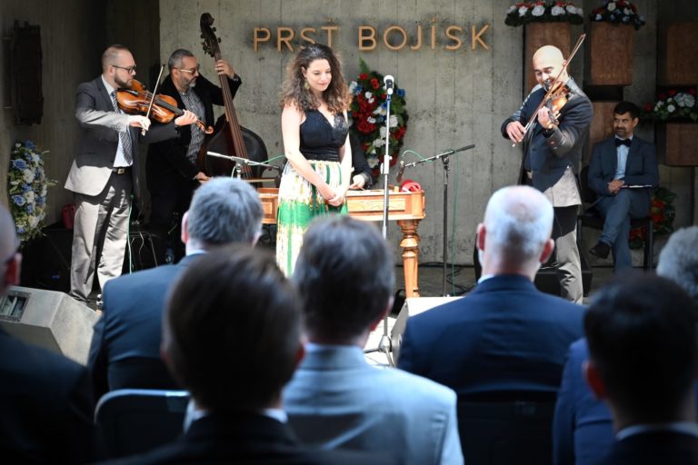 Speváčka Júlia Kozáková (uprostred) počas pietneho podujatia „Nezabudnite si pripomínať! Ma bisteren peske te leperel!“ v banskobystrickom areáli Múzea SNP pri príležitosti Pamätného dňa rómskeho holokaustu. Banská Bystrica, 2. august 2023. Foto: SITA/Jakub Julény