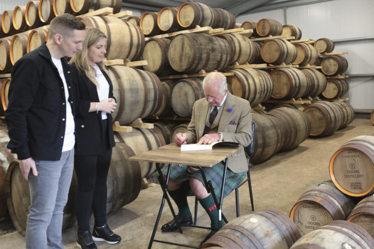 Kráľ Karol III. sa stretol s majiteľmi liehovaru 8 Doors Distillery v John O'Groats, Wick, v Škótskej vysočine, aby oficiálne otvorili liehovar a stretli sa s členmi miestnej podnikateľskej komunity (2. august 2023). Foto: SITA/Robert MacDonald/Pool photo via AP