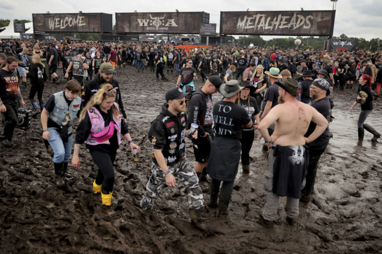 Metaloví fanúšikovia čakajú pri jednom z vchodov na otvorenie areálu festivalu v nemeckom Wackene. Metalový festival Wacken Open Air v severnom Nemecku sa otvára so zníženou kapacitou po tom, čo vytrvalý dážď zmenil areál na blato a prinútili organizátorov nariadiť zastavenie všetkých nových návštevníkov. Organizátori známeho hudobného festivalu vo vidieckej oblasti severozápadne od Hamburgu už v utorok fanúšikom oznámili, že na miesto už nemôžu byť vpustené žiadne ďalšie osobné ani nákladné autá (2. august 2023). Foto: SITA, Christian Charisius/dpa via AP)