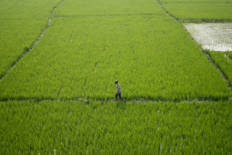 Farmár prechádza ryžovým poľom na okraji Džammú v Indii (2. august 2023). Foto: SITA/AP