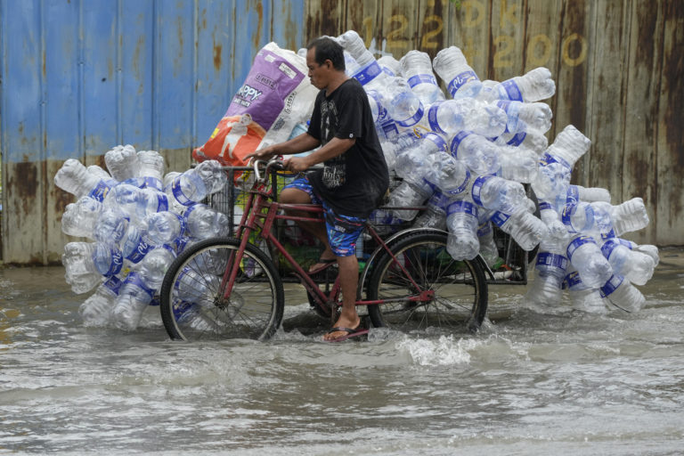 Muž používa svoj pedikab na prepravu použitých plastových fliaš a nádob po zaplavenej ulici v meste Valenzuela na Filipínach. Dážď pokračoval aj po dvoch po sebe nasledujúcich tajfúnoch, ktoré prešli krajinou a spôsobili záplavy v niektorých mestách a provinciách (2. august 2023). Foto: SITA/AP