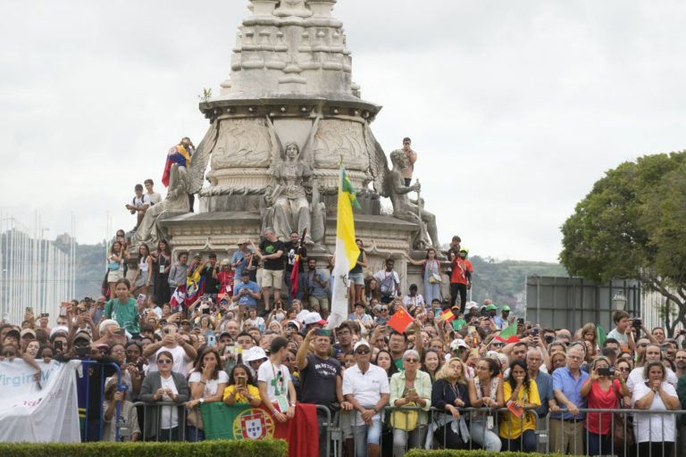 Ľudia čakajú na príchod pápeža Františka do prezidentského paláca Palacio Nacional de Belem v Lisabone. Pápež František pricestoval v stredu do Lisabonu, aby sa v nedeľu zúčastnil na medzinárodných Svetových dňoch mládeže (2. august 2023). Foto: SITA/AP