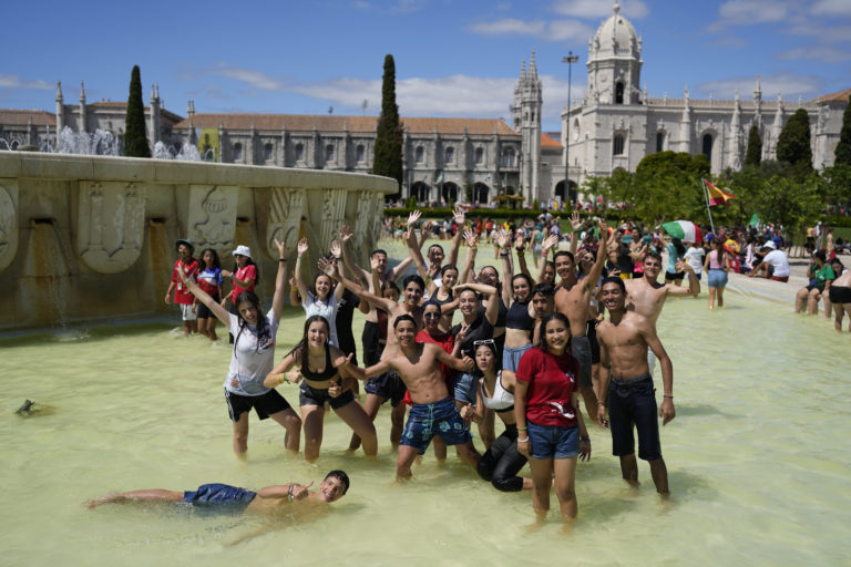 Skupina pútnikov sa osviežuje vo fontáne počas Svetových dní mládeže. Lisabon, 2. august 2023. Foto: SITA/AP.