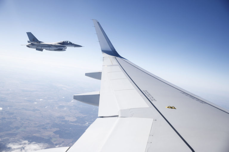 Stíhačky F-16 doprevádzajú lietadlo s pápežom Františkom na jeho ceste na Svetové dni mládeže v Lisabone (2. august 2023). Foto: SITA/AP.