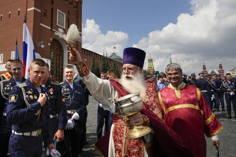 Ruský pravoslávny kňaz žehná výsadkárom počas osláv Dňa výsadkárov a Dňa svätého proroka Iliju v Spasskej veži na Červenom námestí v Moskve. Ruské výsadkové sily oslavujú 93. výročie zriadenia ruských vzdušných síl. Moskva, 2. august 2023. Foto: SITA/AP